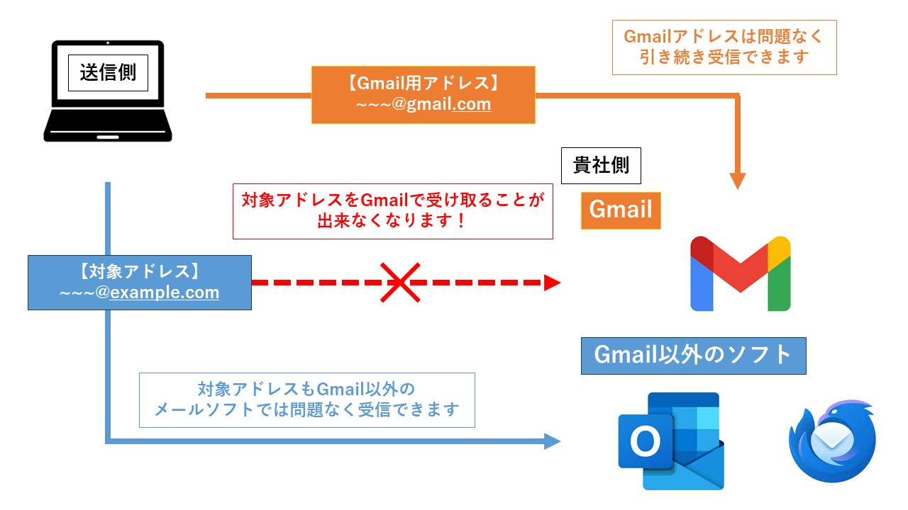 そのため、「~@gmail.com」以外のメールアドレスをPC版 Gmail(無料版)で利用している場合、受信できなくなる見込みです。