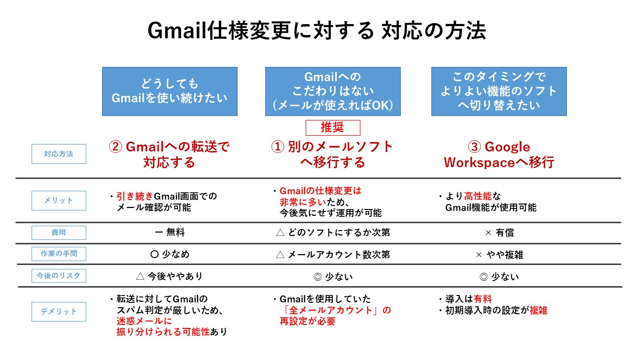 今後も様々な変更が予想されるため、今回のタイミングでの別メールソフトへの移行を推奨しております。